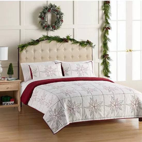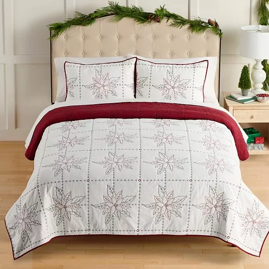 Bring your bedroom decor to life with this delightfully festive Embroidered Poinsettia Quilt Set with Shams from St. Nicholas Square.