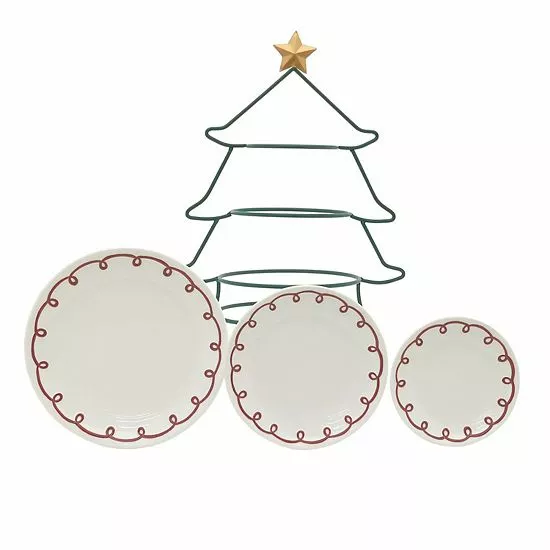 - Festive plates in a tiered tree holder are perfect for serving holiday treats
